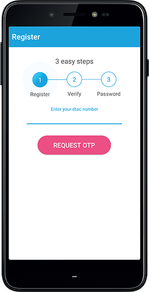 - Register dtac call with your dtac phone number (available for dtac TriNet only). User will receive OTP (One Time Password) via SMS (Short Message Service). Note that OTP will expire within 15 minutes. If you have exceeded the time limit, please request for a new OTP.