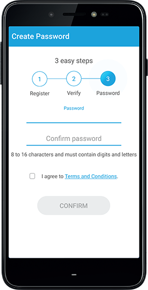 - Set your personal password for login. The password should be 8 to 16 characters long and consist of numbers and alphabets.