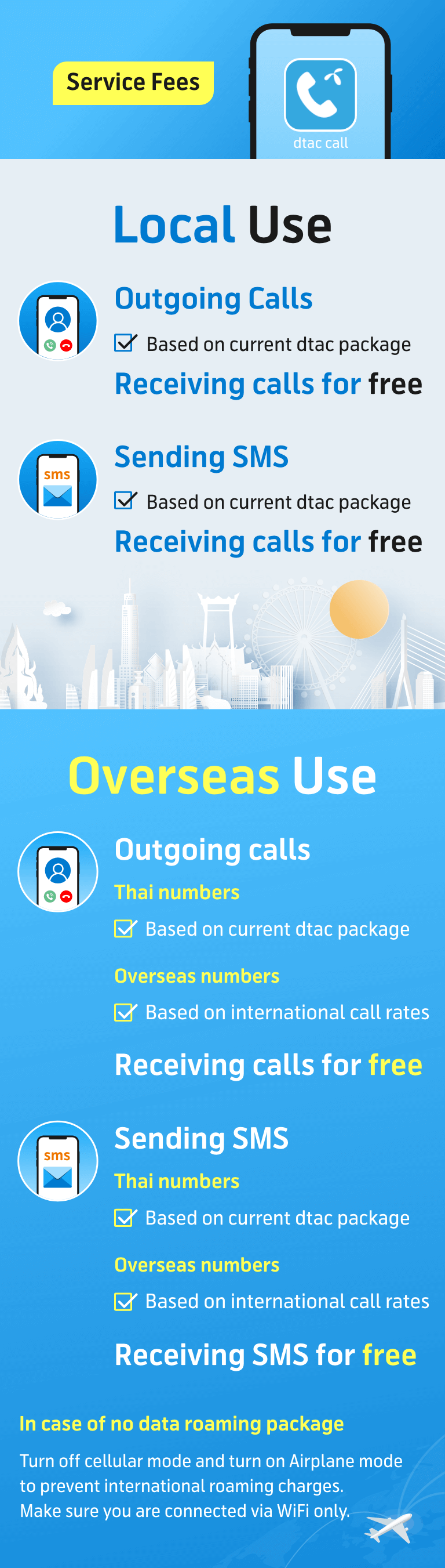 To make/receive a call and send/receive SMS on dtac call application, the service fee will be charged based on your current package as if you are in Thailand;