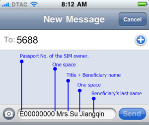 - This privilege is for foreign tourists who use Happy Tourist Sim priced at 49, 199, 299, and 599 baht and registers to received the privilege via SMS 5688 by typing your passport no. of SIM card owner and typing one space followed by specifying beneficiary name, typing one space followed by last name of beneficiary